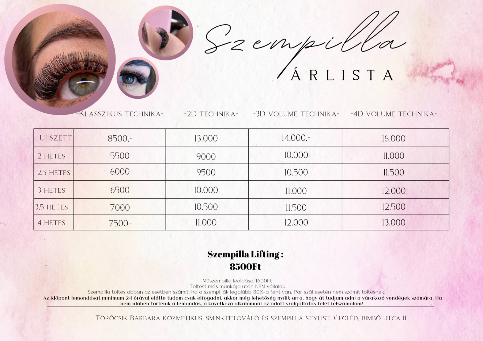 Az árak a 3 hónapon belüli egyszeri korrekciót, valamint utóápoló krémet tartalmazzák.